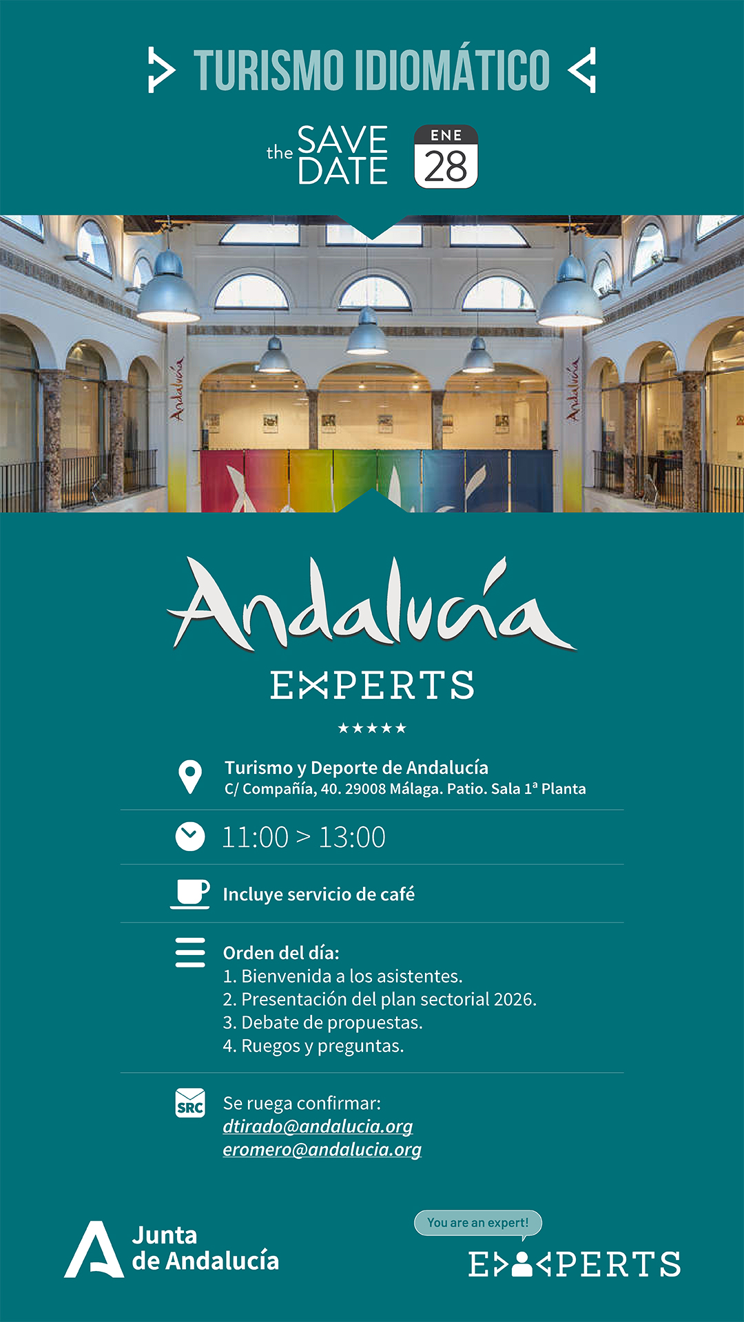 En el marco del III Congreso “Meet Andalucía Language and Culture 2026”, a través del Proyecto Andalucía Experts se busca crear espacios de encuentros profesionales en un marco multidisciplinar, que impulse el diálogo entre administración y el sector privado representativo de la Industria turística. En esta ocasión, se celebra la IV Mesa Experts de Turismo Idiomático.